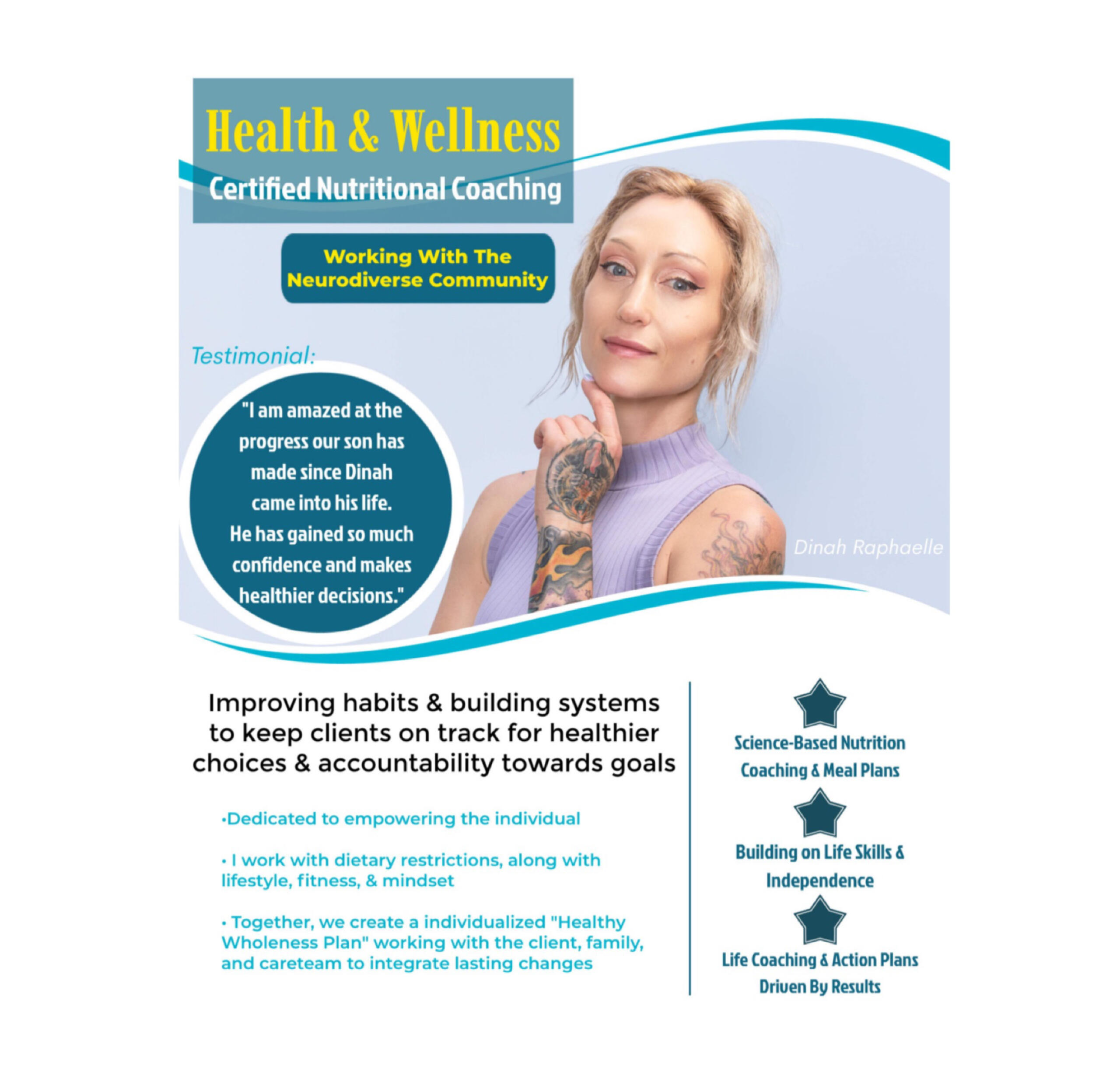 Dinah Raphaelle is a certified nutritional coach (PN1-NC) working with the Neurodiverse community, offering both in person and virtual sessions.I work with the client, family, and care team to integrate changes, turning healthy choices into lasting habits.